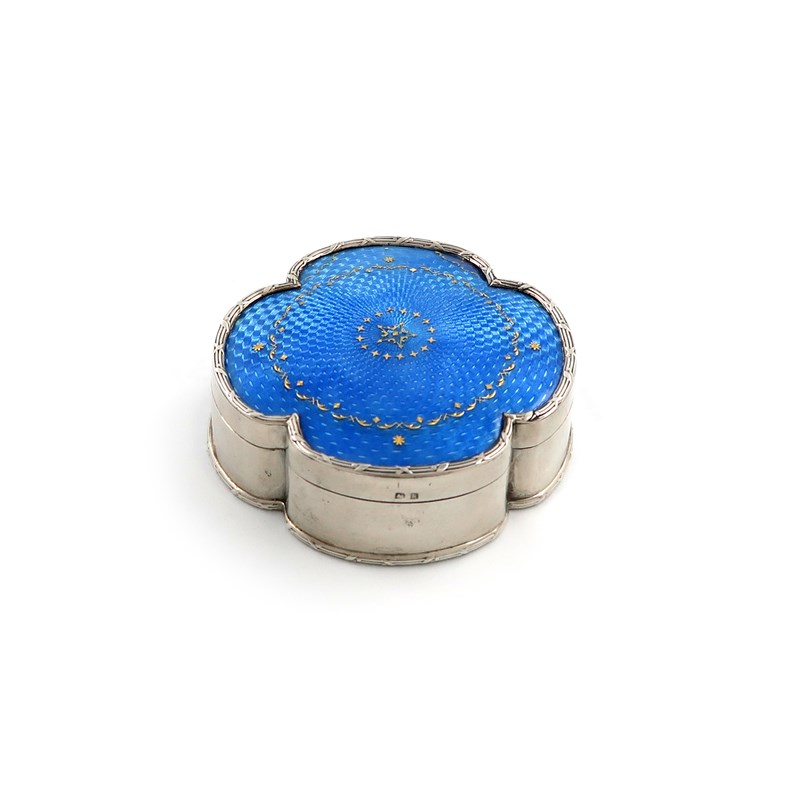quatrefoil form, the hinged cover with blue enamel decoration, with gilt highlights and stars, the base with a ribbon and reed border, length 6.8cm.