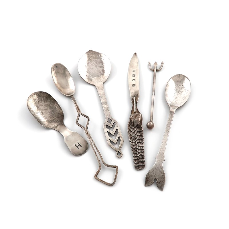 comprising: a pickle fork by A. Bonner, London 1913, a caddy spoon, by NGT, London 1972, the terminal pierced with an 'H', a butter knife and spoon by CF over CE, London 1981 and 1991, and two others, approx. weight 4.5oz.
