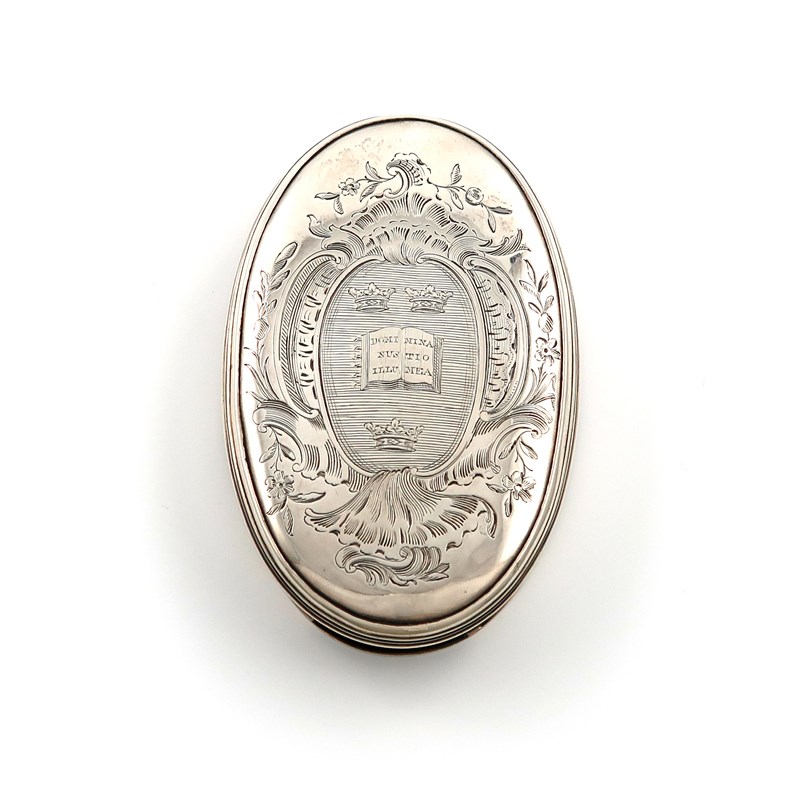 oval form, the pull-off cover engraved with the arms of Oxford University with foliate and Rococo mantling, moulded border, length 9cm, approx. weight 2.4oz.