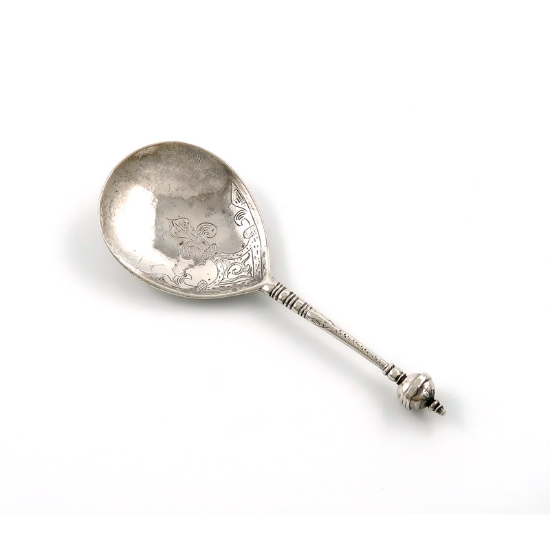 the fig-shaped bowl with engraved decoration, the reverse of the bowl later initialled, the tapering stem with engraved and reeded decoration, and with a ball-knop finial, length 13cm, approx. weight 0.9oz.