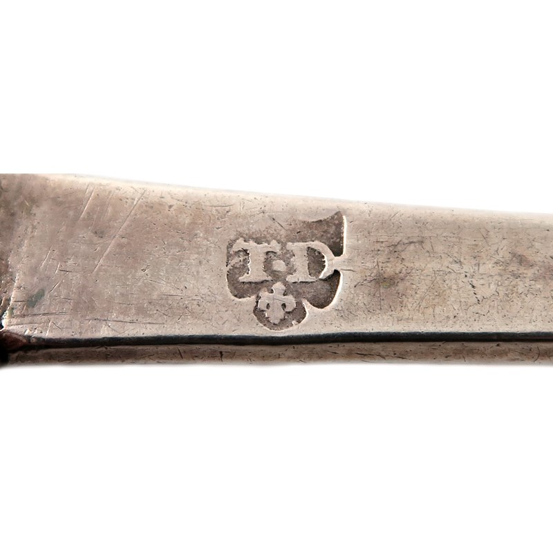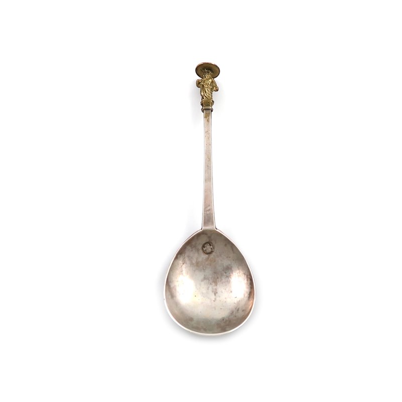fig-shaped bowl, faceted tapering stem with a gilded Apostle finial with a large plain nimbus, with traces of prick dot initials, the reverse of the bowl with an old collection label, length 18.8cm, approx. weight 1.7oz.