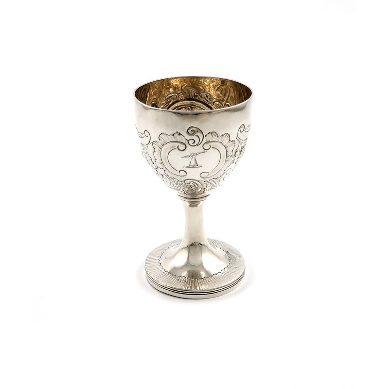 circular bowl, later embossed foliate scroll decoration, on a raised circular foot, with a reeded border and chased decoration, engraved with a crest, height 13.5cm, approx. weight 4.4oz.