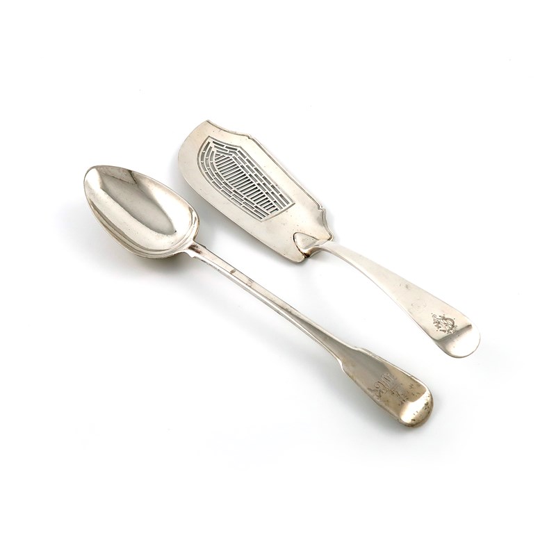 the blade with pierced decoration, the handle later initialled, plus a George III silver Fiddle pattern basting spoon, by Richard Turner, London 1810, approx. total weight 8.7oz. (2)