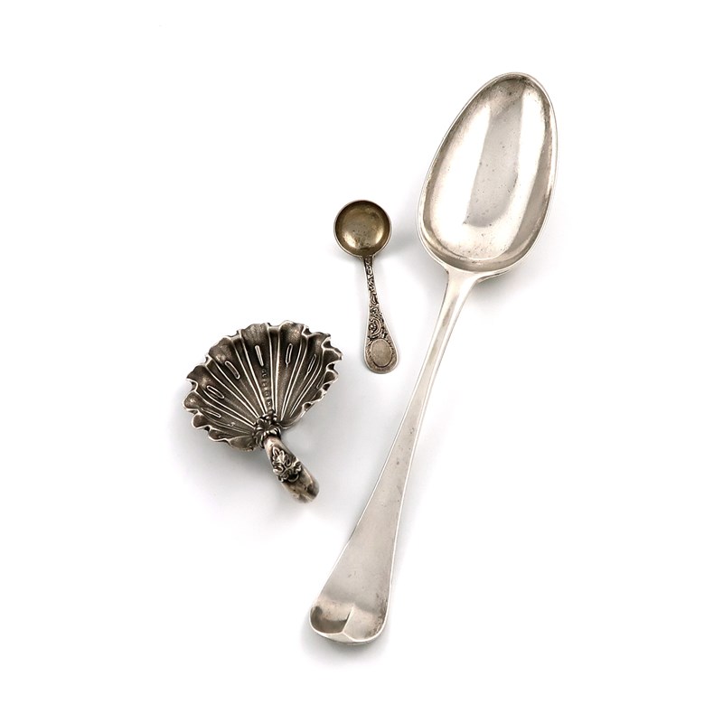 shell bowl, loop and vine handle, length 7cm, plus a George II scroll-back Hanoverian pattern tablespoon, London 1753, and a salt spoon, approx. weight 2.4oz. (3)