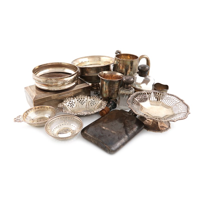comprising: a hip flask, by Mappin and Webb, Sheffield 1918, a silver-mounted glass spirit flask, with a pull-off drinking cup, London 1895, a mug, Birmingham 1937, a modern wine coaster, a two handled bowl, (one handle a.f), a cigarette box, another mug, a pierced tazza, three pierced bonbon dishes, an egg cup, a toilet bottle, and an electroplated bottle stopper, approx. weighable 39oz. (qty)