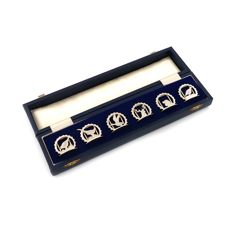 pierced and engraved with game birds, a stag head and a dog head, way-edge circular border, on circular bases, in a fitted case, diameter of base 3cm, approx. weight 2.4oz. (6)