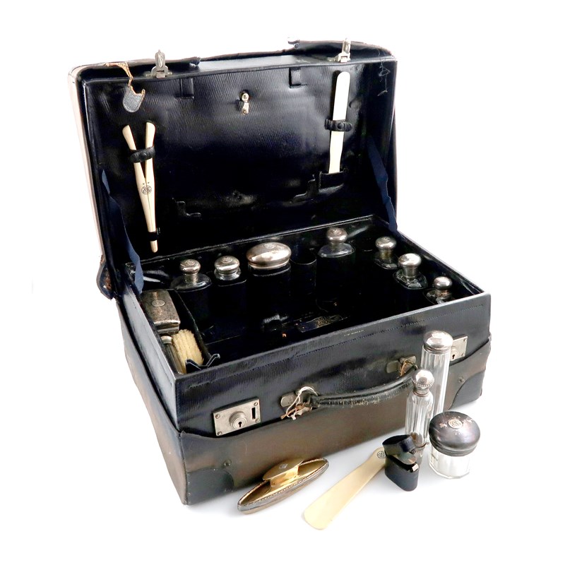 initialled cartouche,comprising: five toilet jars, three scent bottles, a leather-mounted vesta case, a spirit flask, makers mark over-stamping another, London 1920, and ivory items: a shoe horn, page turner, thimble and glove stretcher, plus a French brush and spirit flask, and a nail buffer, in a fitted purple travelling case, with a storm jacket, approx. weighable 2oz.