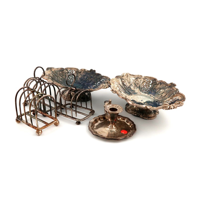 comprising: a Victorian small chamber stick, by Creswick and Co, Sheffield 1844, circular form, moulded border, a pair of pierced oval dishes, by H. Atkins, Sheffield 1892, plus three toast racks, approx. weight 34oz. (6)