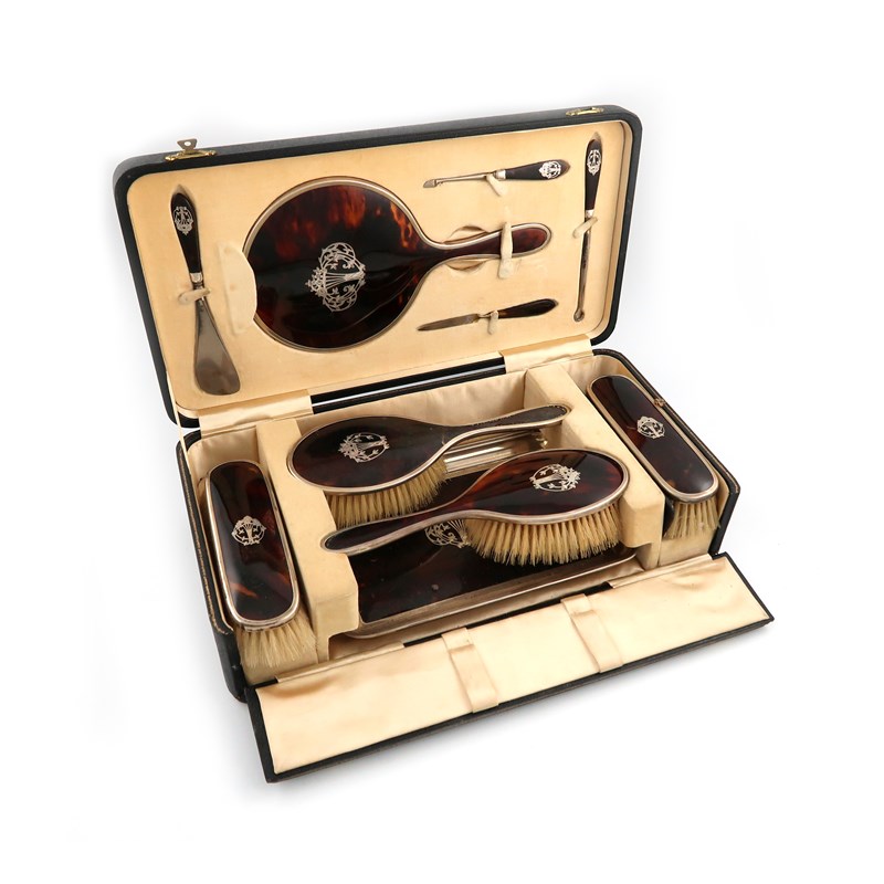λA silver and tortoiseshell dressing table set