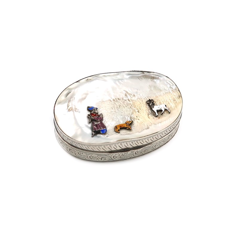 oval form, the hinged cover set with a mother-of-pearl panel and applied with an enamelled hunter kneeling before a stag, with a cross in its antlers, and with a dog by his side, the sides and base with engraved foliate scroll decoration, length 9.2cm.