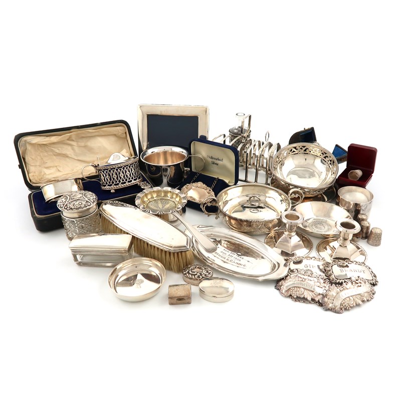 comprising: two toast racks, a pair of Norwegian dwarf candlesticks, a two-handled bowl, a pair of pierced bonbon dishes, four ashtrays/dishes, a continental tea strainer on an English stand, a mug, a mustard pot, a frame, a cased napkin ring, another napkin ring, a salt cellar, a scent bottle, two toilet jars, a brush, a lid, three pill boxes, five thimbles, four wine labels and two electroplated wine labels, approx. weighable 34oz. (qty)