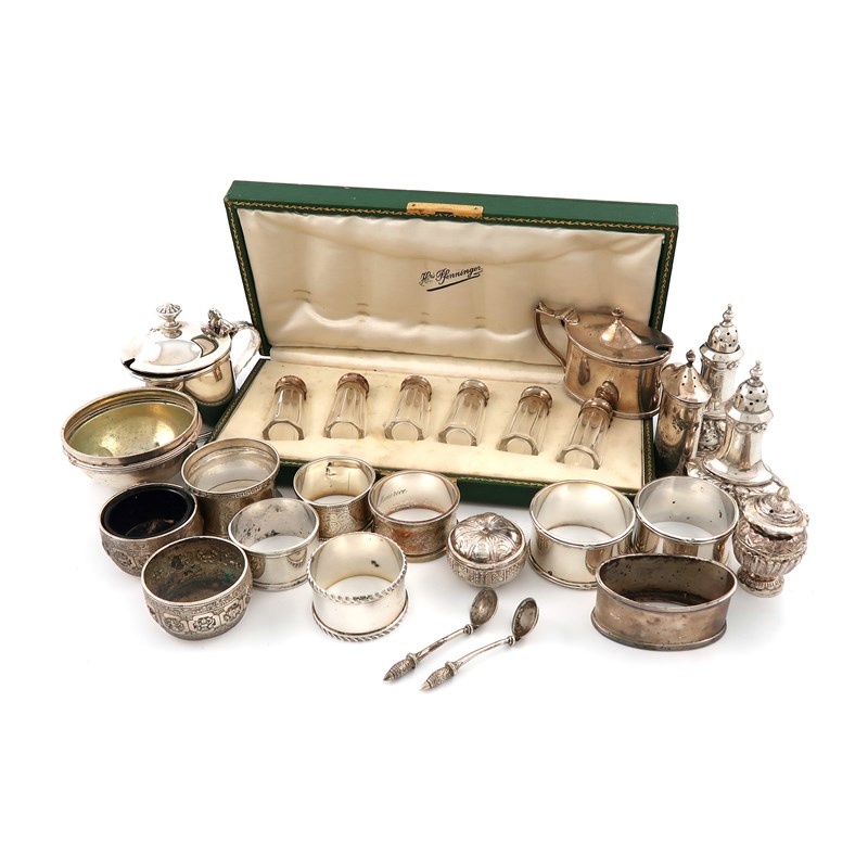 comprising: a George III mustard pot, by J. Angell, London 1819, circular form, leaf capped scroll handle, domed cover with a fluted finial, a cased set of six French silver-mounted glass pepper pots, a three-piece condiment set, a pair of pepper pots, a pair of salt cellars and spoons, seven napkin rings, a single salt cellar and two other items, approx. weighable 24oz. (qty)