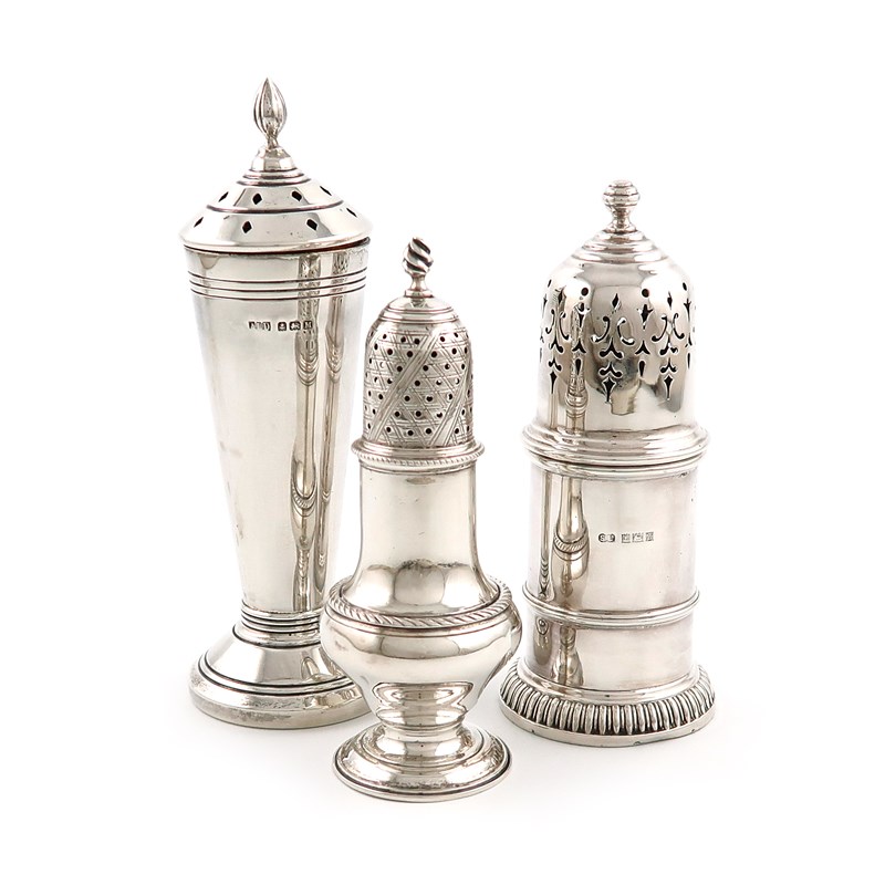 comprising: a George III pepper pot, by Samuel Woods, London 1763, baluster form, rope-work border, with an associated pierced pull off cover, by T. Daniell, plus a sugar caster of lighthouse form, by William Suckling Ltd, Birmingham 1960, and an Art Deco sugar caster, by A L Davenport Ltd, Birmingham 1936, tapering circular form, wooden underside of base, approx. weighable 7.7oz. (3)