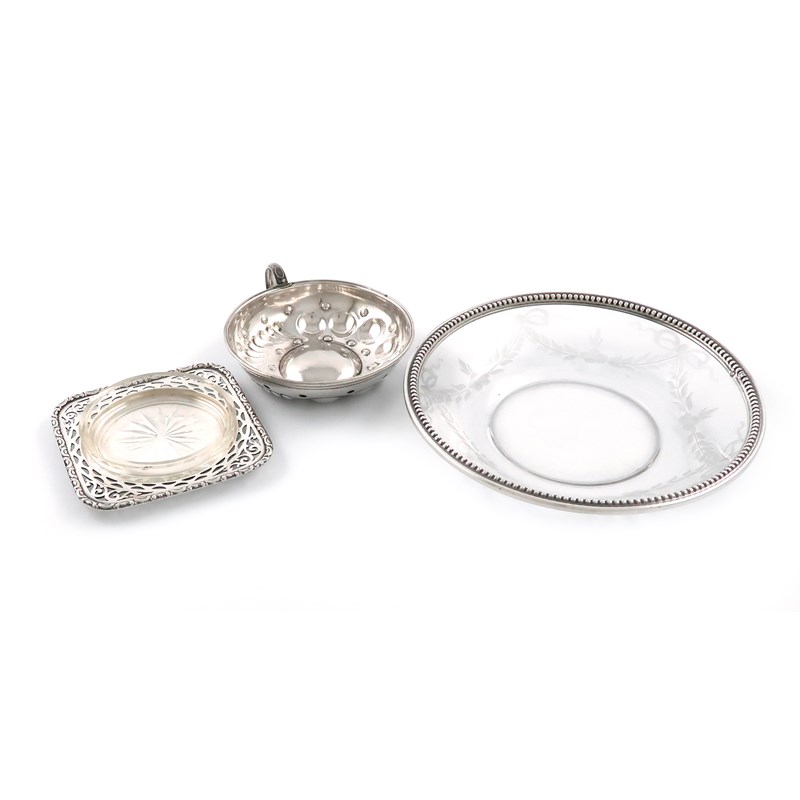 comprising: a French wine taster, circular form, punch bead and fluted decoration, ring-handle, plus a French silver-mounted glass dish, with a beaded border and engraved foliate decoration, and a German silver butter dish of square form, with a clear glass liner 3.2oz. (3)