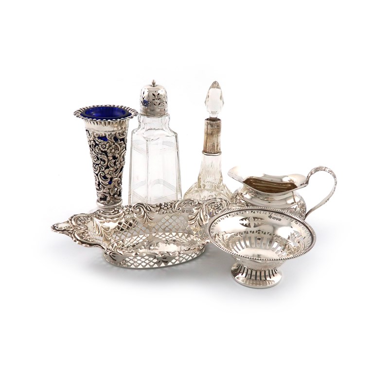 comprising: a late-Victorian cream jug, by Nathan and Hayes, Chester 1898, a pierced bonbon dish of oval form, a circular bonbon dish, a pierced trumpet vase, Chester 1900, with a blue glass liner, a silver-mounted scent bottle and a silver-mounted glass sugar caster, approx. weighable 7.5oz. (6)