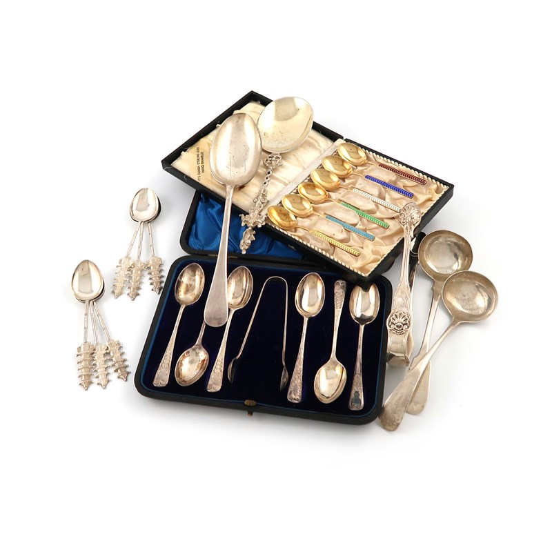comprising: a figural spoon, London 1913, a cased set of six Danish silver-gilt and enamel spoons, a cased set of teaspoons, a pair of tongs, two ladles, six Chinese teaspoons and an electroplated tablespoon, approx. weighable 11oz. (qty)