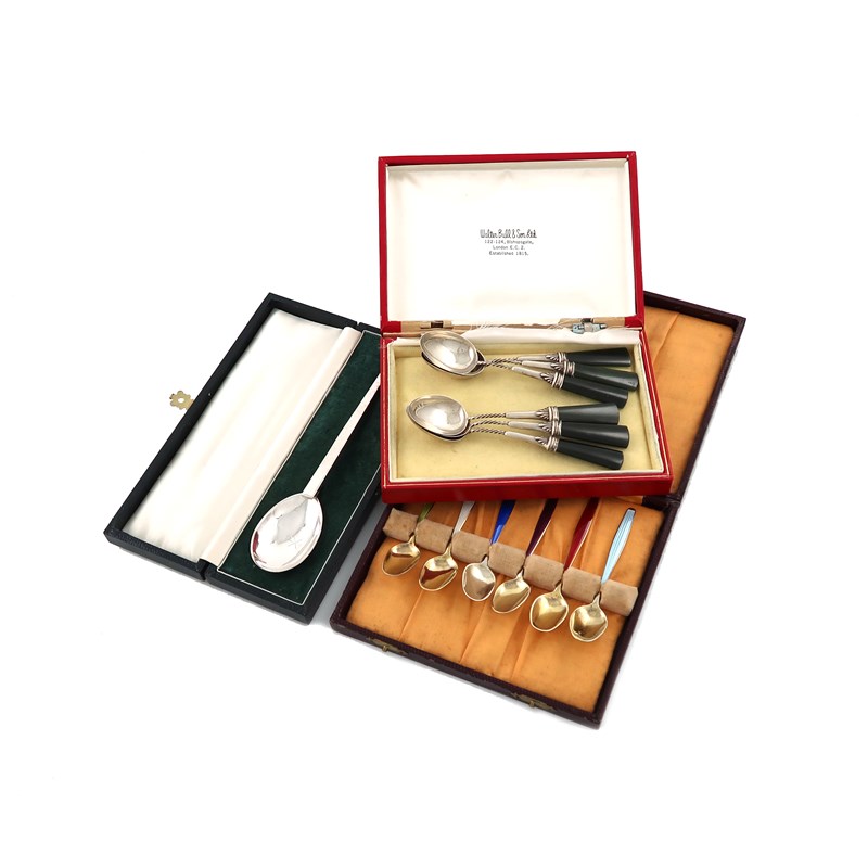 the handles with vari-coloured enamel decoration, in a fitted case, plus a set of six silver and nephrite teaspoons, by J and R Griffin, Chester 1924, cased, plus a modern copy of a Roman spoon by Anvic Silver Ltd, approx. weight 4oz. (3)