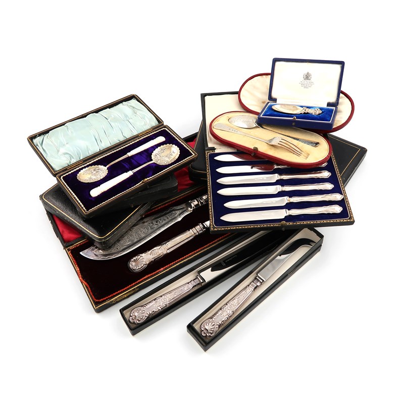 comprising: an Asprey caddy spoon, London 1969, with Prince of Wales feathers, a pair of jam spoons with mother-of-pearl handles, Sheffield 1899, a fork and spoon, four sets of teaspoons, set of six silver-handled cake knives, a bread knife, a cheese knife, and a pair of fish servers with silver handles and plated blades and tines, approx. weighable 11oz. (qty)