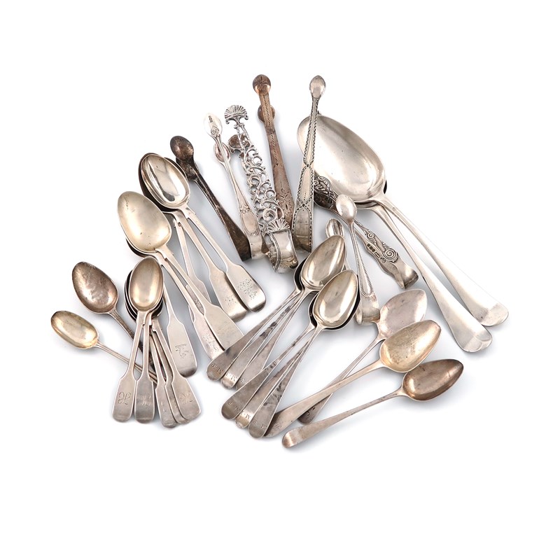 comprising: two Hanoverian pattern tablespoons, seven pairs of sugar tongs, twenty teaspoons and a jam spoon, approx. weight 21oz. (qty)