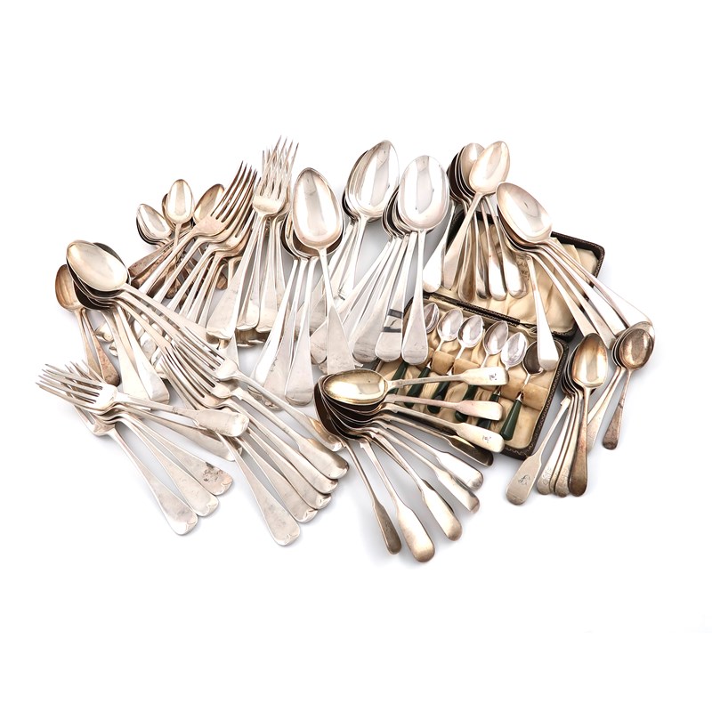 comprising: fourteen table forks, fourteen tablespoons, seventeen dessert spoons, ten dessert forks, and eighteen teaspoons, plus two Fiddle pattern dessert forks, eleven Fiddle pattern teaspoons, a set of cased New Zealand nephrite handed teaspoons, by Joseph Swindell and Sons, approx. weight 117oz. (qty)