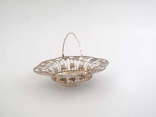 An early George III wire work sweetmeat basket, shaped with applied scrolling vine leaf decoration, twisted swing handle, on a collette foot, by Arthur Annesley, London 1761, 6.9in (17.7cm) wide, 4.4oz.