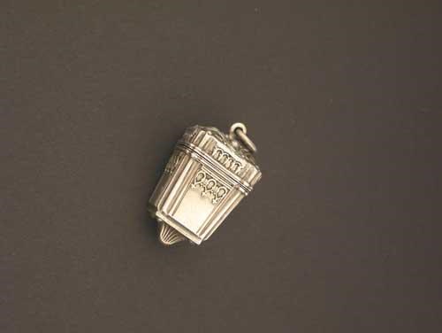 A Victorian pendant thimble box, with applied decoration the hinged cover revealing a later gilt lift out grille, Archibald Douglas, London 1873, 1.5oz, (4cm high), 0.4oz.