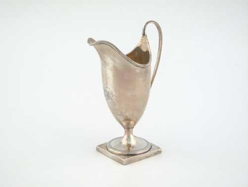 A George III plain helmet cream jug, on a square pedestal foot with reeded borders and loop handle, initialled 'JEW', by Thomas Shepherd, London 1792, 5.75in (14.2cm) high, 3.5oz.