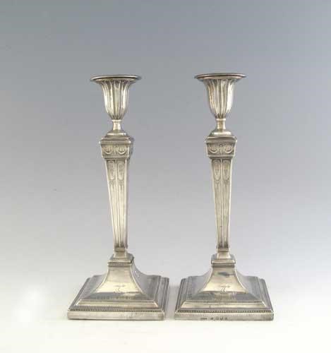 bright-engraved Neoclassical candlesticks, on rising square bases, fine bead borders tapering fluted columns and urn shaped capitals, initialled by John Parsons & Co, Sheffield 1788 (loaded), 12in (30.5cm) high. (2)