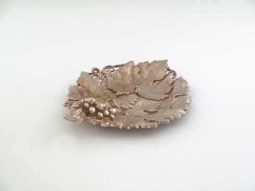 A Victorian electrotyped, Britannia standard dish, in the form of matted vine leaves, and a bunch of grapes, by Elkington, Mason and Co, Birmingham 1844, 9.75in (25cm) long, 13.5oz.