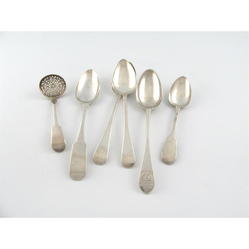 comprising: a pair of George IV old English pattern tablespoons, by Robert Gainsford Sheffield 1823, a Victorian Fiddle pattern sifting spoon, Exeter 1852, a Newcastle tablespoon, an Irish tablespoon, and an Exeter dessert spoon, approx. weight 11oz. (6)