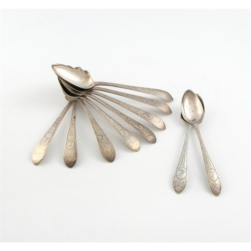 A set of eight George III Irish silver Bright-cut dessert spoons,