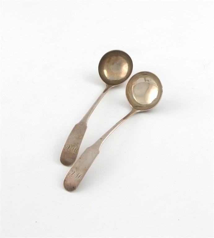 A pair of George III Scottish silver Fiddle pattern toddy ladles,