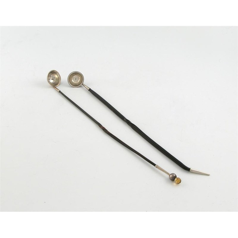 plain circular bowls, twisted whalebone handles, one with a plain terminal, the other with a glass thistle terminal. (2)
