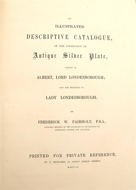 Fairholt, F.W: An Illustrated, Descriptive catalogue of the collection of Antique Silver Plate formed by Albert, Lord Londesborough, Now the property of Lady Londesborough, printed for private reference - 1860 gilt tooled half leather bound with marbled boards and bound with a letter from the author.