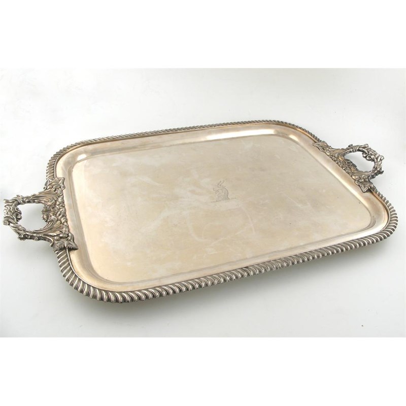 rectangular form, gadroon border, foliate scroll handles, the centre engraved with a crest, the whole on four bun feet,