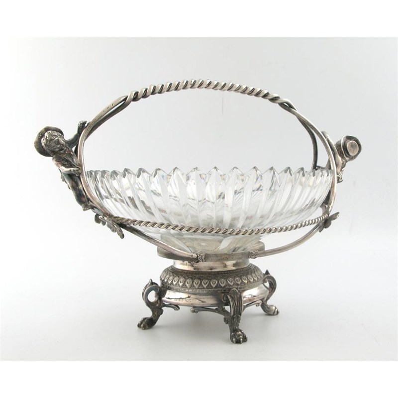 circular base on four lion paw feet, wire-work frame, twist handle supported by a cherub on either side, fitted with a cut-glass liner,
