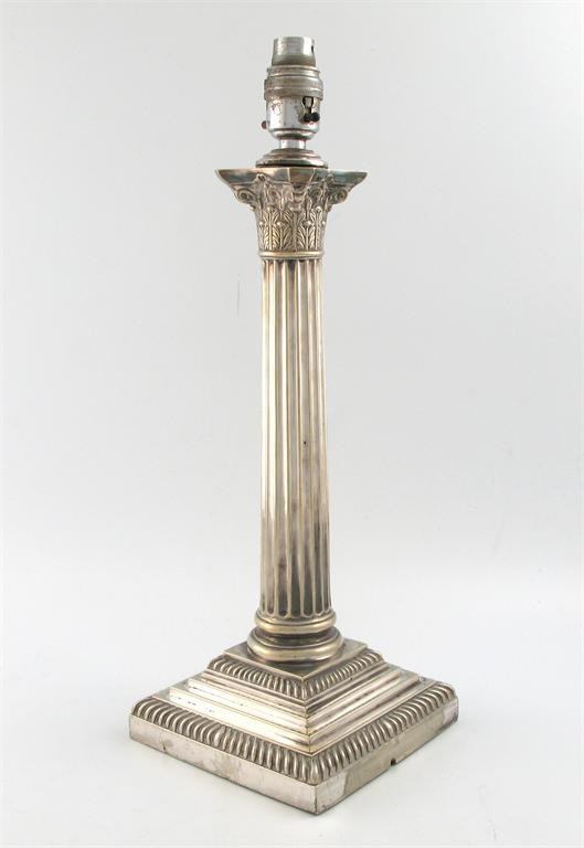 Corinthian column form, gadroon borders, fluted column, converted for electricity, height 35.5cm.