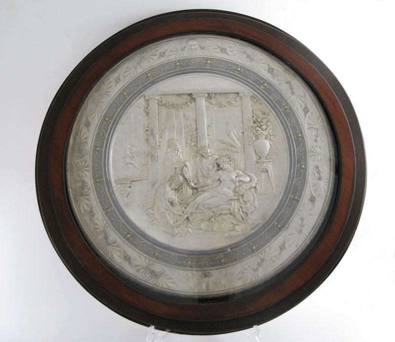 of circular form, depicting Venus being attending by her servants, set in a classical interior, with stylised borders with gilded highlights, with a registration lozenge, in a later fitted case, diameter 48.5cm.