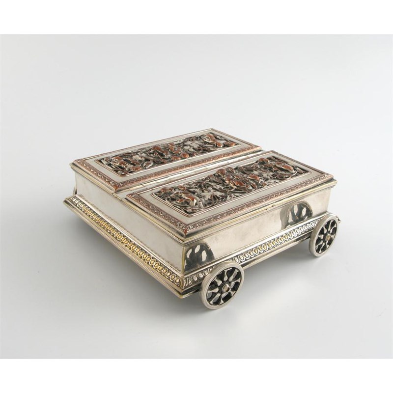 A Victorian electro-type and electroplated double table snuff box trolley,