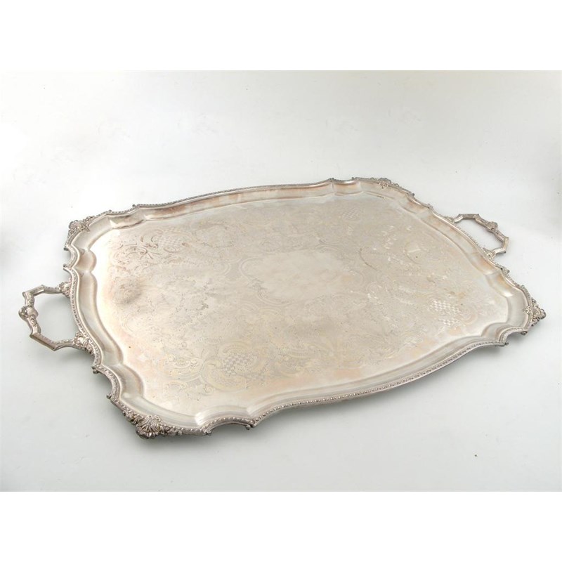 shaped rectangular form, stylised border with shell motifs, the centre with engraved foliate and scroll decoration, inscribed to reverse ' Reproduction of the Paul de Lamerie Period, circa 1728', length 73cm.