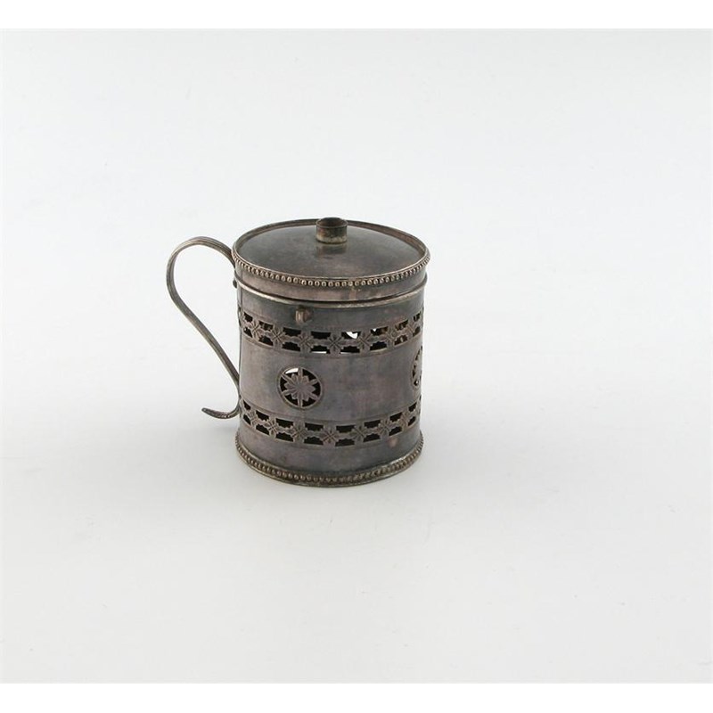drum form, pierced foliate decoration, beaded borders, reeded scroll handle, height 6.8cm.