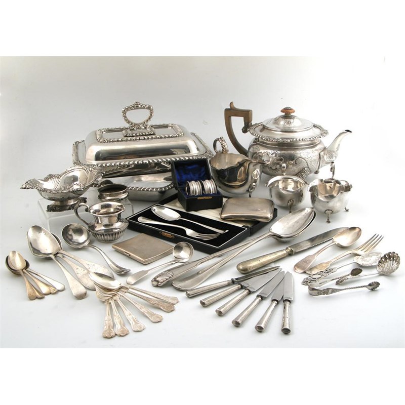 comprising silver items: a sauce boat of oval form, by The Adie Brothers, Birmingham 1924, two further sauce boats, a cased pair of napkin rings, an Exeter cream ladle, a cased fork and spoon, a bob bon dish, two cigarette cases, a set of six tea knives, a table spoon, two German table spoons, a sifting spoon, a jam spoon, and four other items of flatware, approx. weighable 30 oz, plus an old Sheffield plated tea pot, two electroplated basting spoons, an entree dish and cover and other items. (qty)