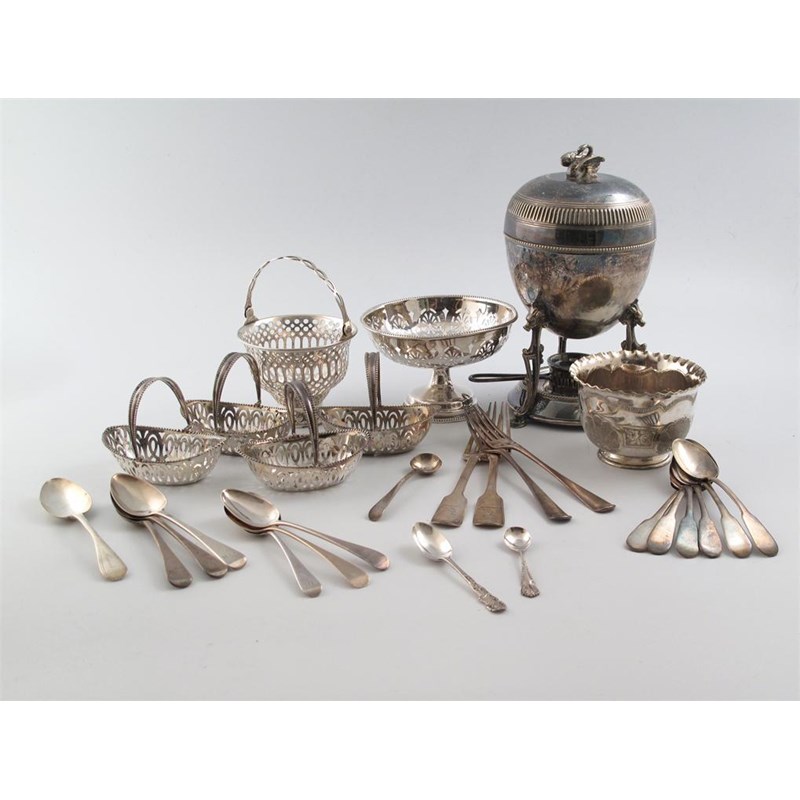 comprising silver items, a set of four pierced swing-handled bon bon baskets, a pierced basket, a bon bon dish, four dessert forks, fourteen tea spoons, and two condiment spoons, approx. weighable 18oz, plus an electroplated egg coddler and a bowl. (qty)