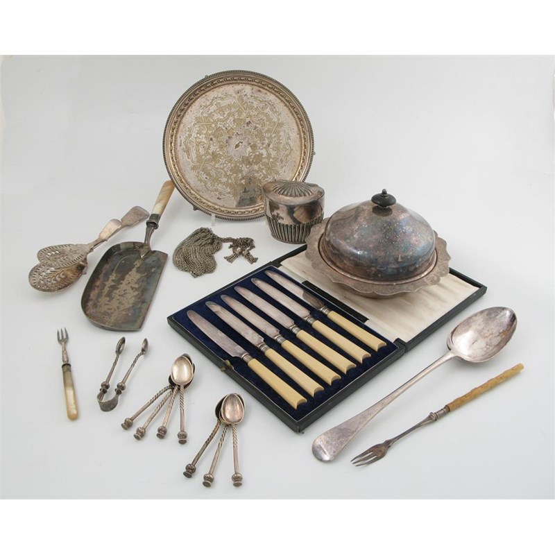 comprising: a tea caddy and a caddy spoon, a waiter, a muffin dish and cover, a crumb scoop, a pair of serving tongs, a basting spoon, a cased set of knives and other items. (qty)