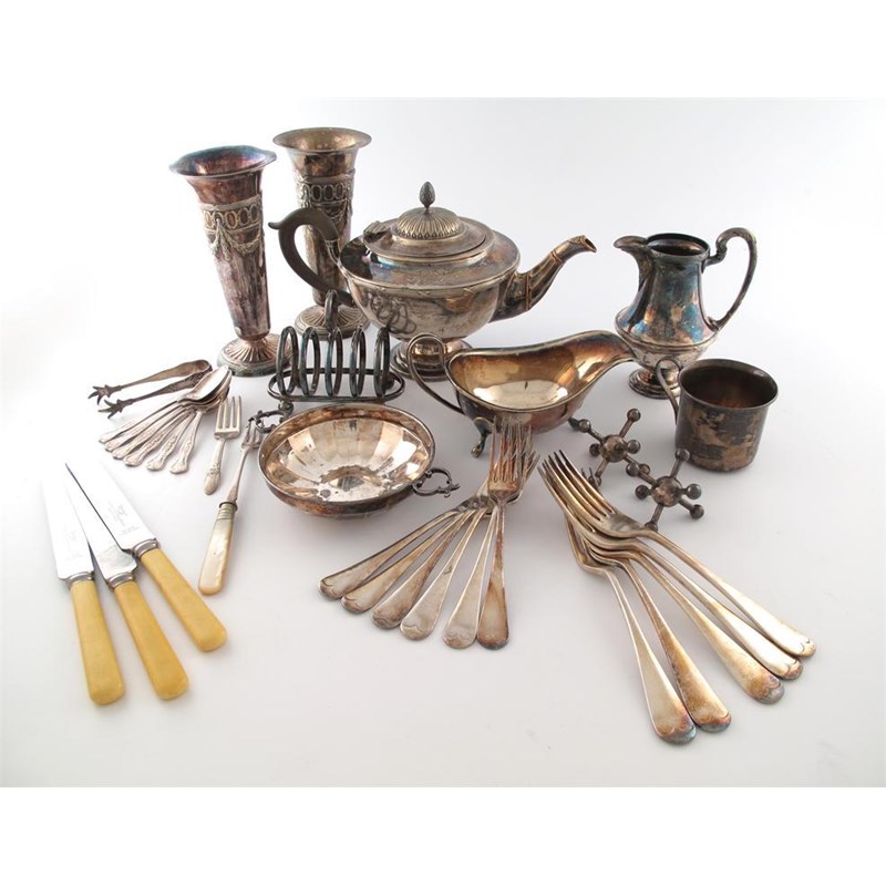 comprising: a pair of vases, a tea pot, a cream jug and sugar bowl, a pair of oval sauce boats,various entree dishes, a toast rack, a cruet set, and other items including a small quantity of flatware. (qty)