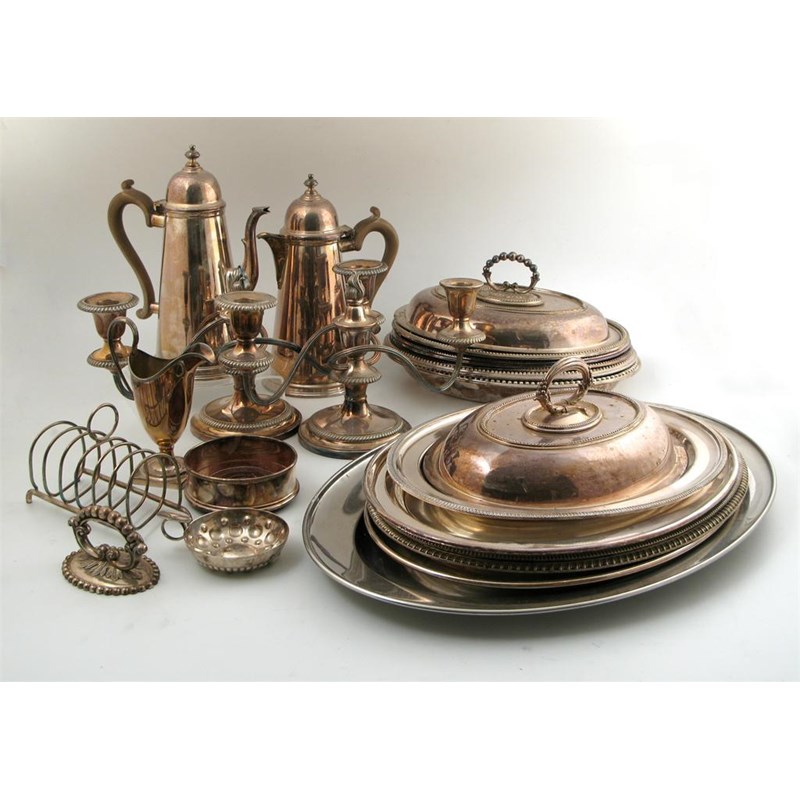 comprising: a pair of cafe au lait pots, in the George I manner, tapering circular form, domed hinged covers, retailed by Asprey, plus a pair of dwarf candelabra, various entree dishes and meat dishes, a wine taster, and a silver cream jug, of helmet form, London 1973. (qty)