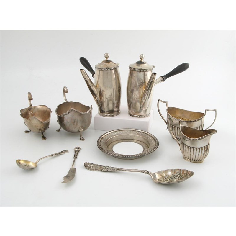 A pair of cafe au lait pots, by William Hutton & Son, London 1900, plus an Art Nouveau butter knife and matching sugar sifter, a berry spoon, initialled 'P', a cream jug and matching sugar basin with reeded lower bodies, a pierced circular bottle coaster, and two sauceboats.