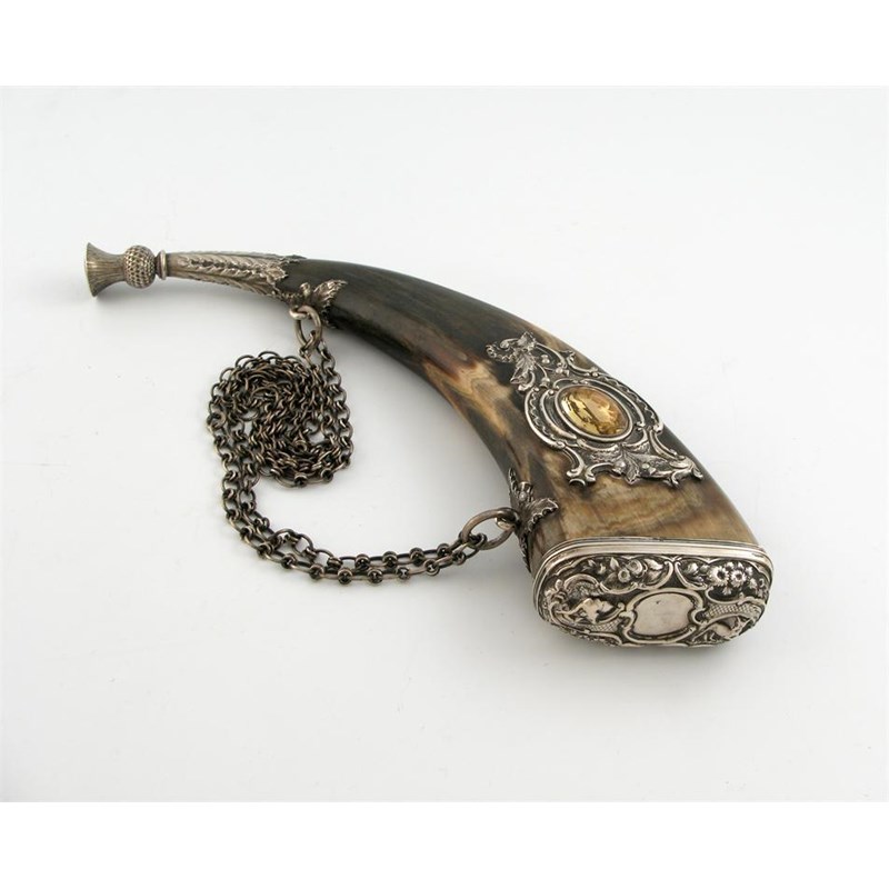 the silver silver mount with a hound and fox amongst foliate scroll decoration, the pressed horn body with a thistle terminal, and with a chain, length 30cm.