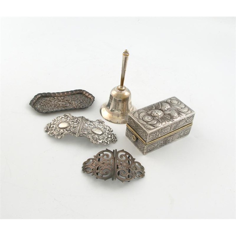 an Edwardian, small, stamped pin tray, by Henry Matthews; two nurse's buckles, a curling tong warmer, embossed with angels and clouds, Wolfsky & Co Ltd, and a electroplated table bell.