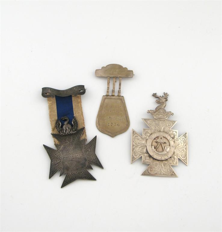 Freemasonry, Phoenix Lodge, silver cross-shaped jewel, surmounted with a phoenix in the flame, Gen1 Washington Lodge, engraved presentation inscription, to "Bro. Fdk. E. J. Musselbrook ... Apl. 19 1890", Maker AR, London, 1889, 68 x 51mm; Ancient Order of Foresters, silver cross-shaped jewels, first for Merit, surmounte with coronet and stag's head, centre roundel bugle, rev engraved presentation inscription, "...Bro. C. J. Grantham ... Feb y 1893", maker's mark MDL, 1892 and ADL [Abraham David Loewenstark], trademark, 84 x 56mm; and a small badge "Trenton / Princetown, 1774"